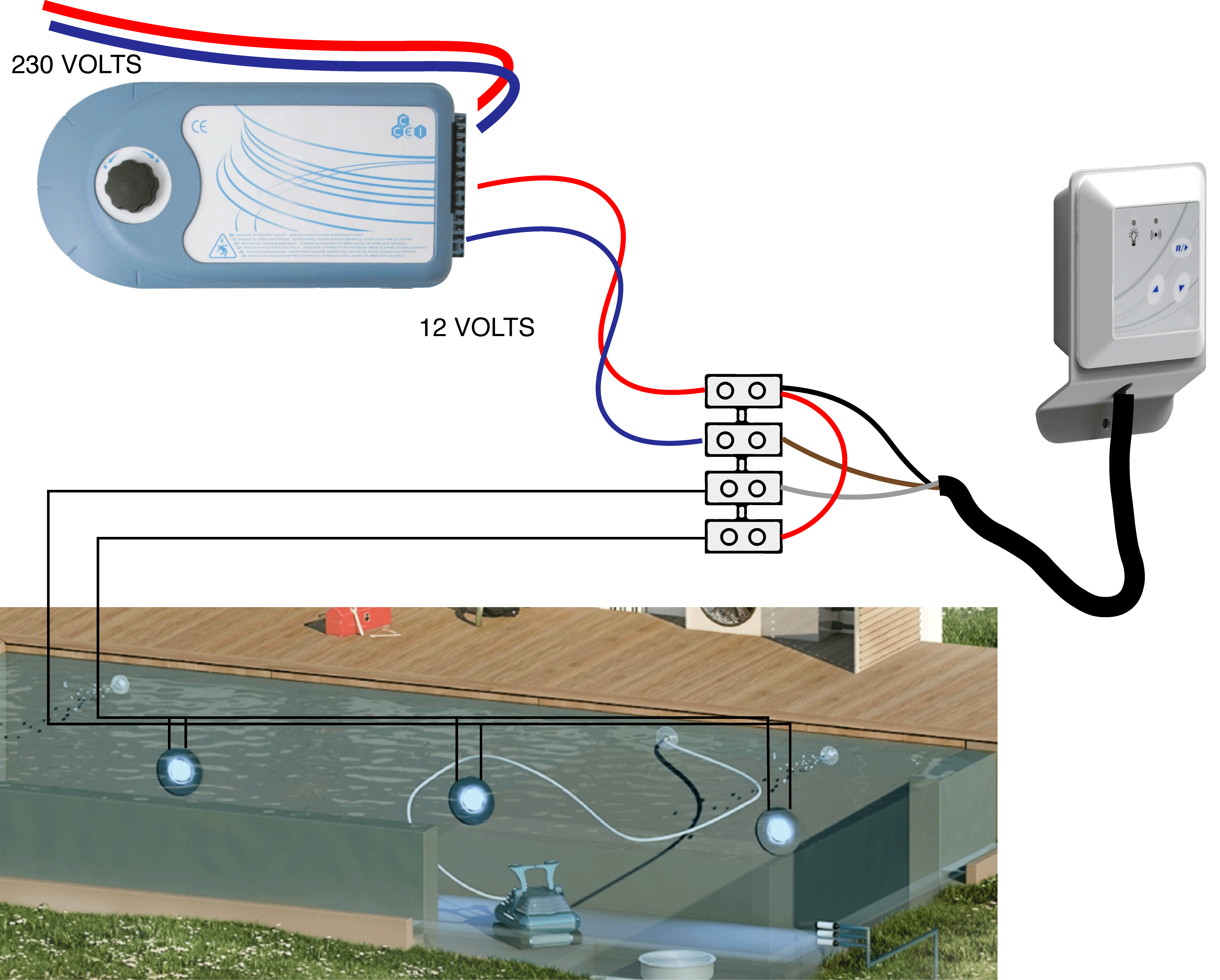 le système remote color (rc) permet de choisir à distance les couleurs des projecteurs à led brio installés dans votre piscine à l'aide d'une télécommande radio et d'un contrôleur transmettant les informations aux projecteurs. Ce procédé ne requiert aucun câblage particulier et peut commander les projecteurs distants de plusieurs dizaines de mètres. Les changements de couleurs sont contrôlés à distance par une combinaison de micro-coupures de l'alimentation.