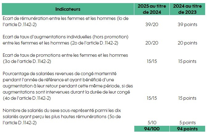 Cette obligation légale permet d’évaluer les différences de rémunération et de promotion entre les hommes et les femmes et porte sur 5 critères notés sur un total de 100 points.