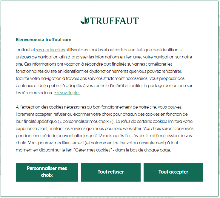 | Consentement | · Envoi d’informations et d’offres commerciales par Truffaut | Jusqu’à 3 ans après le dernier contact émanant de la personne concernée |